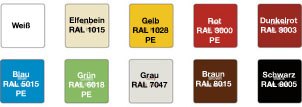 Weiß, Elfenbein (RAL 1015), gelb (RAL 1028 auch PE), rot (RAL 3000 auch PE), dunkelrot (RAL 3003), blau (RRAL 5015 auch PE), grün (RAL 6018 auch PE), grau (RAL 7047), braun (RAL 8015), schwarz (RAL 9005).